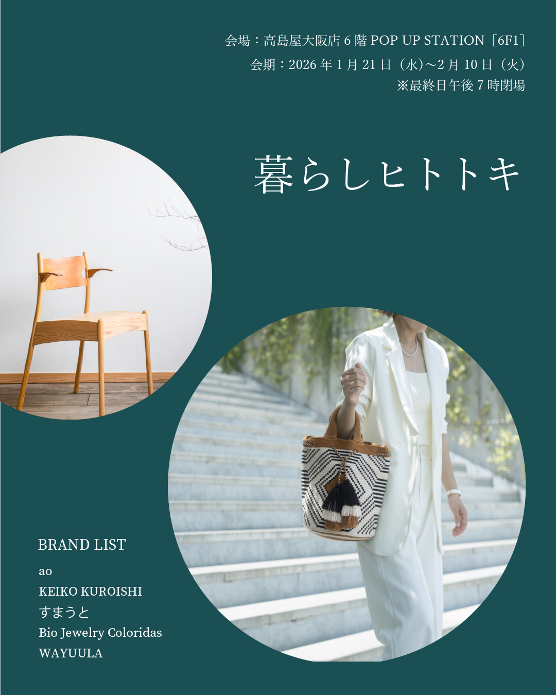 Pop up Shop / Event 1/28 – 2/3 高島屋大阪店 6階 POP UP 1/28〜2/3に、高島屋大阪店6階に出店いたします。 当イベントでは黄金の草ビオジュエリーをご用意しております。 近隣の皆様是非お越しいただけましたら幸いです。 お待ちしております。 ■会期 : 2026年1月28日(水)- 2026年2月3日(火) ■会場 : 高島屋大阪店6階 POP UP STATION 【6F1】 ■お問い合わせ先 :コロリーダス鎌倉店 ※営業時間等の詳細は高島屋大阪店の公式ホームページをご覧ください。 シェア Tweet